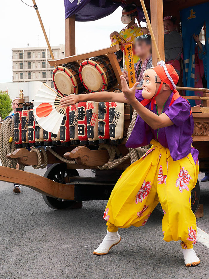 駅周辺の雑踏を掻き分け巡行中の山車(上溝夏祭り)(2024年7月撮影)